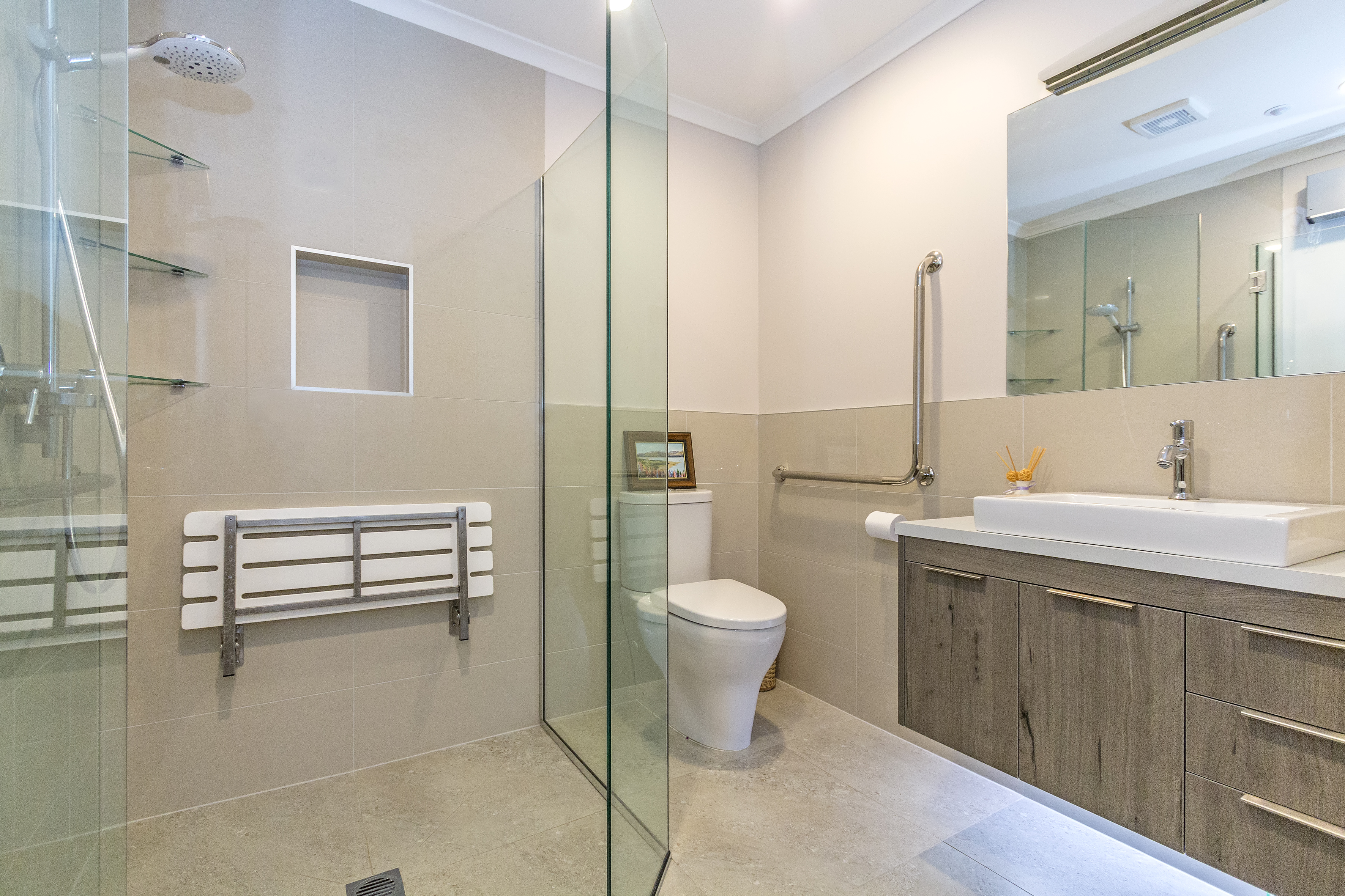 The kitchen is divided into an open entertainer’s area and a separate service space with sink and storage. Double ovens make catering twice as easy. The home’s layout ties in seamlessly with outdoor living areas, protected from prevailing winds and neighbours. Solar panels make it energy efficient and in-slab central heating makes for happy feet in winter.